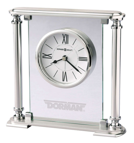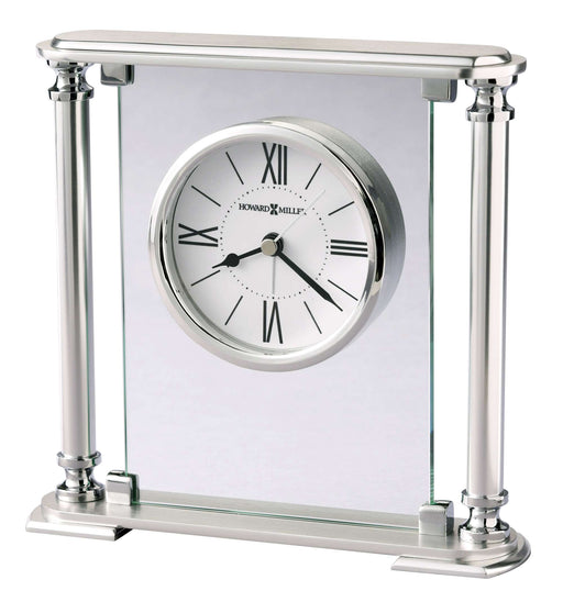 Silver-finished metal and glass alarm clock with polished silver columns. Metal tabletop clock with brushed silver finished top, base, and feet wi...