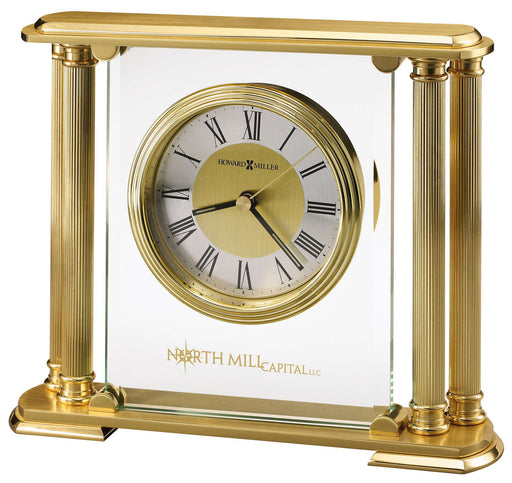 TABLE CLOCK: The Audra Alarm & Table Clock has a brushed and polished brass finish with a decorative handle, brass button feet, and columns to ...