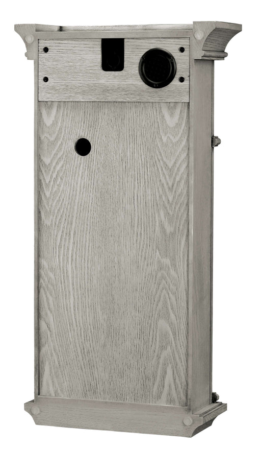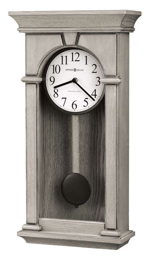 Pendulum wall clock with a white-gray finish on select hardwoods and veneers and flat glass panel. Quartz, battery-operated, single-chime movement...