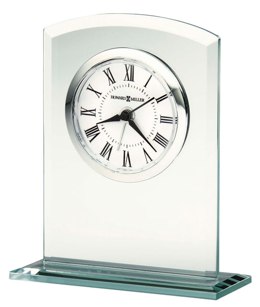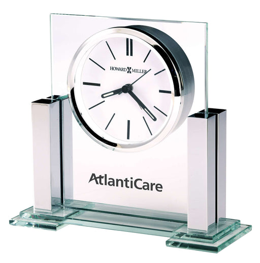 Glass and metal alarm clock features a glass panel supported by polished silver finished square columns on a clear glass base. White dial, black...