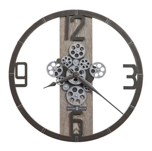 Oversized wall clock with silver-finished, moving gears. Charcoal finished wrought iron border and Seaside Gray finished center wood panel. Quartz...
