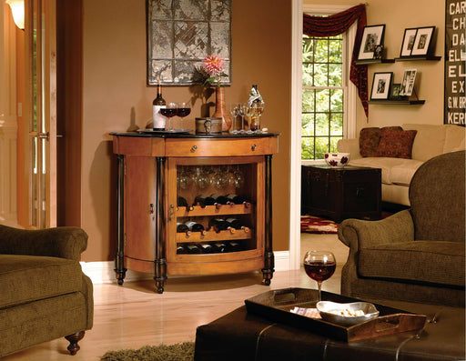 This Wine & Bar cabinet has a distressed Vintage Umber finish and Worn Black finished posts, this demilune (half-moon) console offers plenty ...