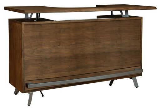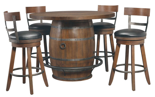 This bar stool features a brown wood finish on select hardwoods and veneers with heavy, artistic distressing and metal components finished in aged...