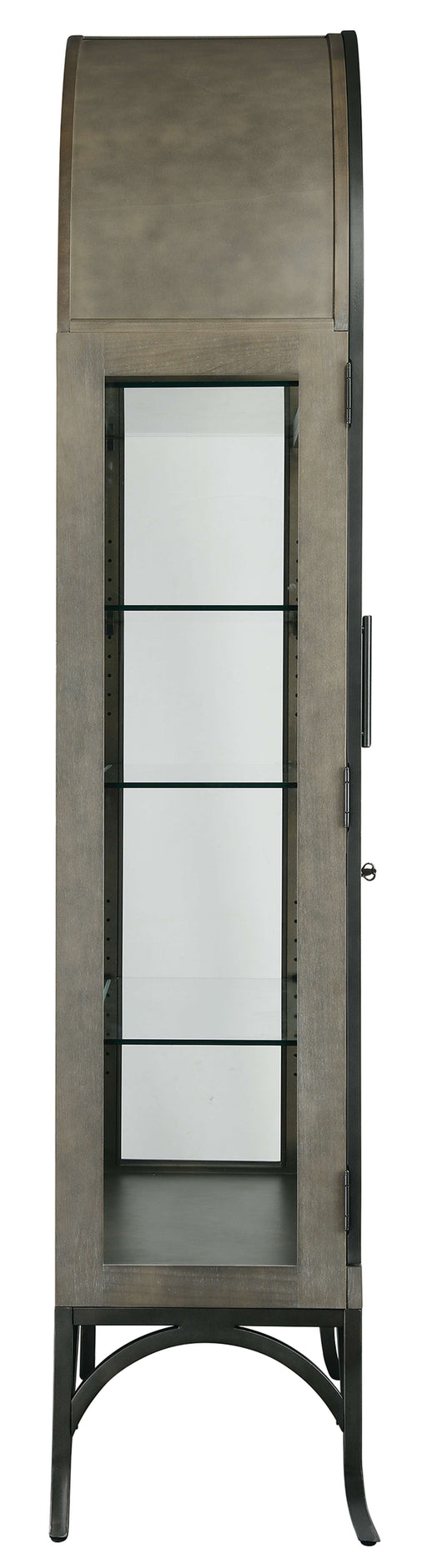 Aged Taupe finish on select hardwoods and veneers. Front locking door with beveled glass slides in both directions for convenient access to the sh...