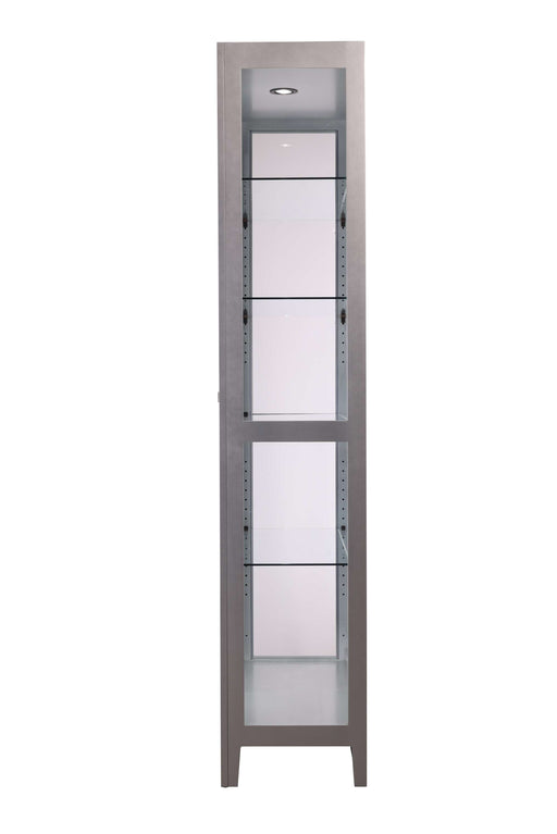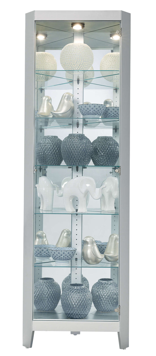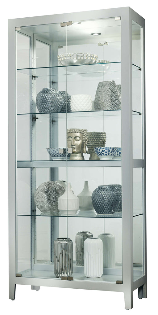 Silver finish on select hardwoods and veneers. Flat top curio features hinged glass doors with brushed nickel hinges and doorknobs. The design a...