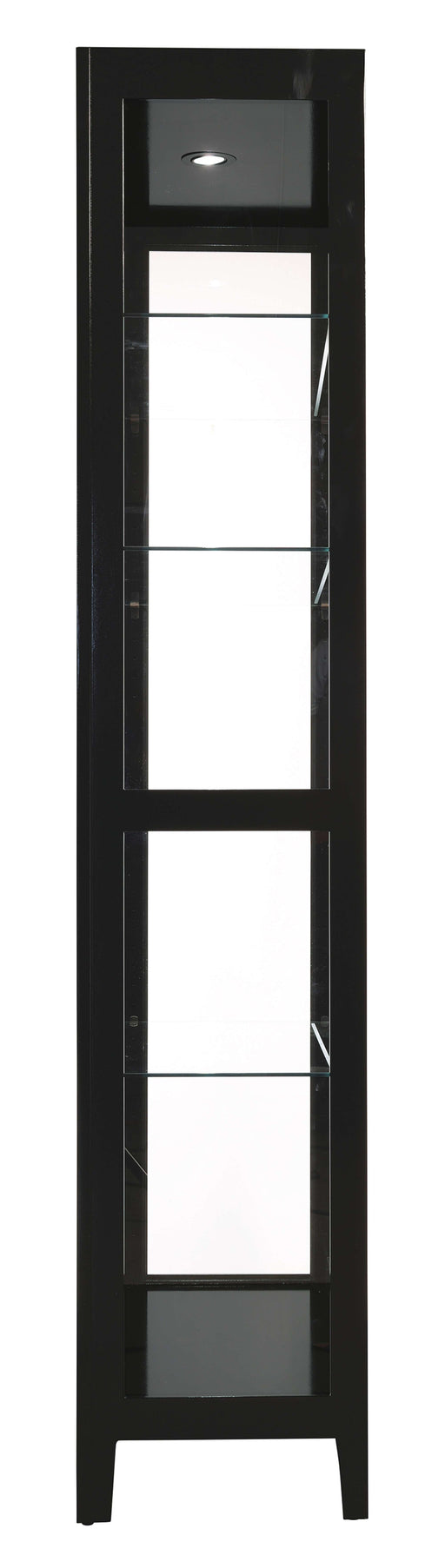 Gloss Black finish on select hardwoods and veneers. The flat-top corner curio features a hinged glass door with brushed nickel hinges and a doork...