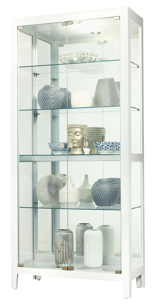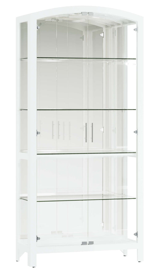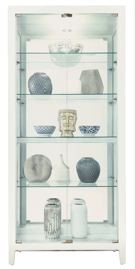Gloss White finish on select hardwoods and veneers. Flat top curio features hinged glass doors with brushed nickel hinges and doorknobs. The des...