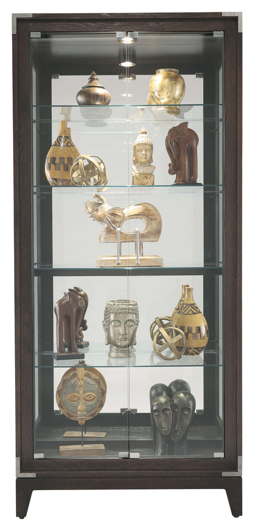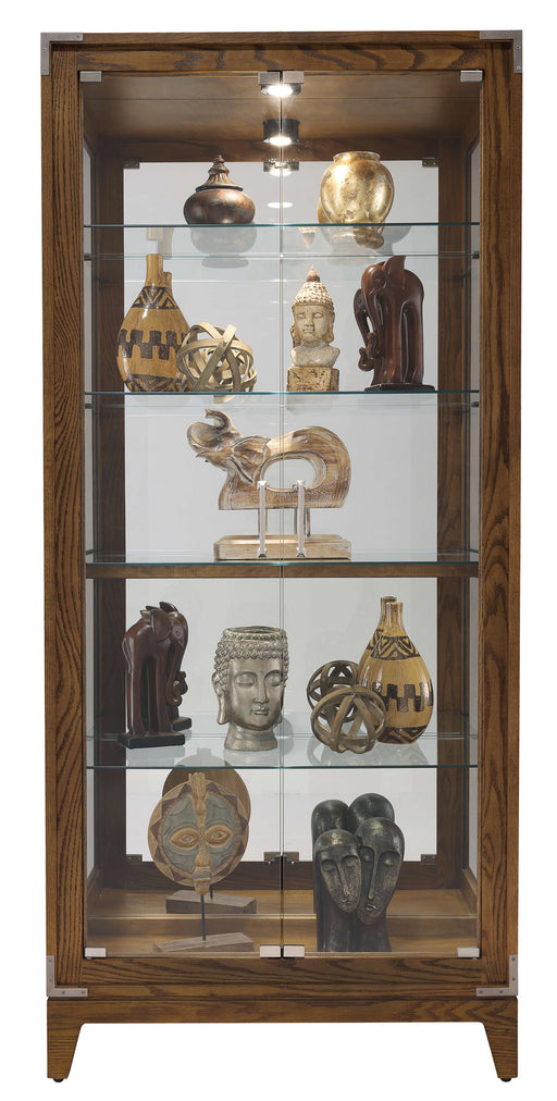 Dark CoffeeOak finish on select hardwoods and veneers. Thisrectangular curio sits atop a legged base. Hinged glassdoors with brushed nickel hing...