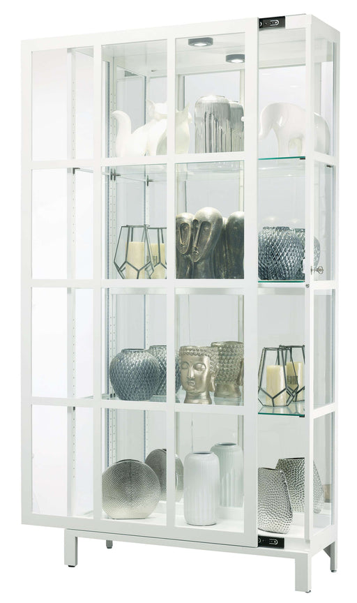 Gloss White finish on select hardwoods and veneers. The glass-pane front door slides in both directions and has a lock to secure items inside. Mir...