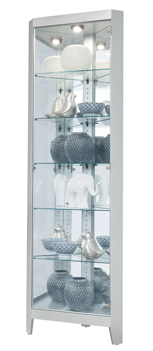 Silver finish on select hardwoods and veneers. The flat-top corner curio features a hinged glass door with brushed nickel hinges and a doorknob. ...