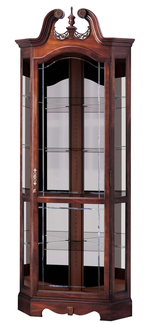 Dark Coffee Oak finish on select hardwoods and veneers. Flat top pediment curio features arched beveled front glass adorned with two decorative ...